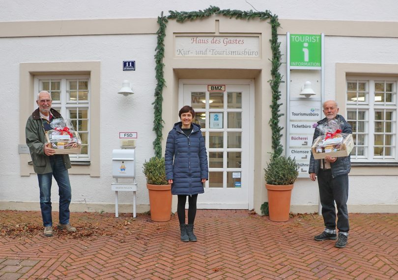Foto: Prien Marketing GmbH – (v.l.n.r.) Die Geschäftsführerin der Prien Marketing GmbH Andrea Hübner (im Bild mittig) bedankte sich mit Präsentkörben voller regionaler Köstlichkeiten bei Claus Linke und Gerhard Märkl, die mit ihrem ehrenamtlichen Engagement das Erstellen einer einheitlichen Wander- und Freizeitkartografie ermöglicht haben.