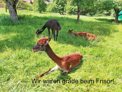 Das Alpaka, auch Pako, ist eine aus den südamerikanischen Anden stammende, domestizierte Kamelform, die vorwiegend wegen ihrer Wolle gezüchtet wird. Der Bestand an Alpakas in Peru liegt bei etwa 3,5 Millionen Tieren, was ca. 80 Prozent des weltweiten Bestandes ausmacht – so heißt es bei wikipedia. Aber nicht nur in Südamerika, sondern auch am Samerberg gibt es diese geschätzten Tiere – wie diese aktuellen Bilder von Grainbach nach dem “Frisör-Besuch” der Alpakas zeigen.