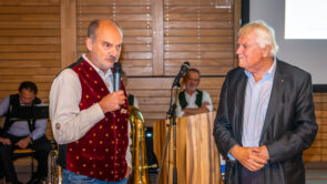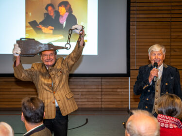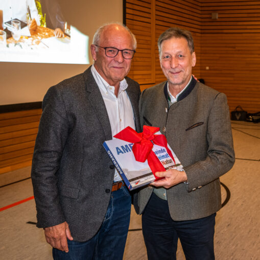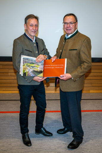 Stolz überreicht Rupert Rußwurm dem Ameranger Bürgermeister das erste Exemplar des Heimatbuches.