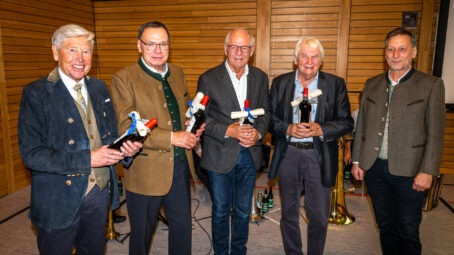 Amerangs Bürgermeister Konrad Linner dankt dem Redaktionsteam für ihre Arbeit. Von links nach rechts: Wolfgang Klautzsch, Altbürgermeister Gust Voit, Rupert Rußwurm, Dr. Otto Helwig, Bürgermeister Konrad Linner.