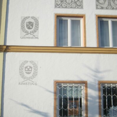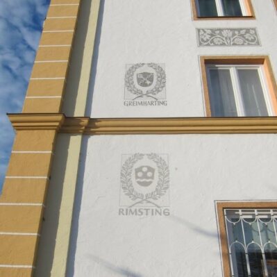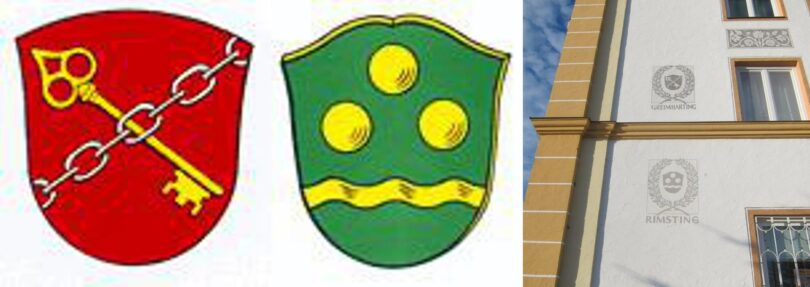 Die Gemeindewappen von Rimsting und Greimharting spiegeln ihre lokale Kultur und religiösen Traditionen wider. Das Rimstinger Wappen symbolisiert mit einem Wellenbalken und drei Kugeln den Chiemsee und den heiligen Nikolaus, während das Greimhartinger Wappen mit Schlüssel und Kette die Verehrung des heiligen Petrus und Leonhard darstellt.