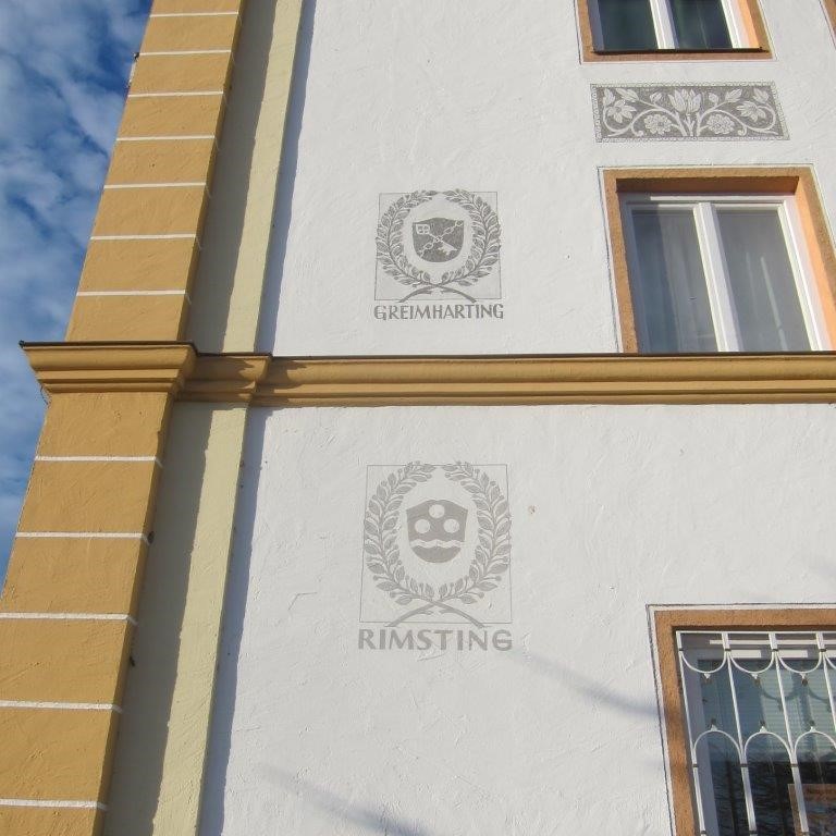 Die Wappen auf der Fassade des Rimstinger Rathauses.