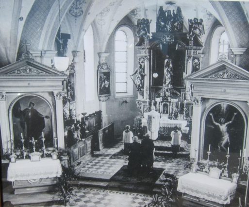 In der Mitte des Hochaltars zeigt eine Schnitzgruppe der Krönung Mariens durch die heilige Dreifaltigkeit (um 1520). Von 1655 bis 1959 befand in der Mitte des Altares das Wallfahrtsbild, „Der leidende Heiland“, heute –leider- seitlich in der Kirche.