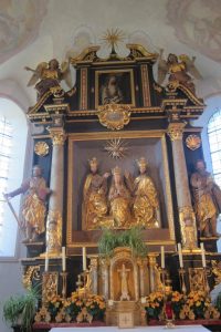 Das Gotteshaus beherrscht der prunkvolle, in feierlichen Schwarz und Gold gehaltene Hochaltar. Frühbarock, knapp 400 Jahre alt. Bild von Johann Nußbaum