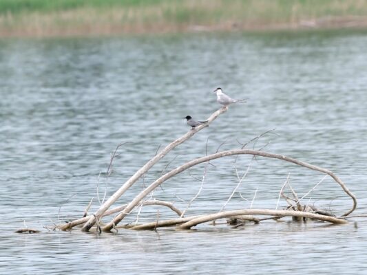 Die Prienmündung mit der kleinen Kiesinsel ist immer für eine Überraschung gut. Heute waren noch eine Trauerseeschwalbe (dunkler Vogel) und eine Flussseescchwalbe da und jagten die letzten Maifliegen. Ansonsten beginnt das Familienleben auf dem See.