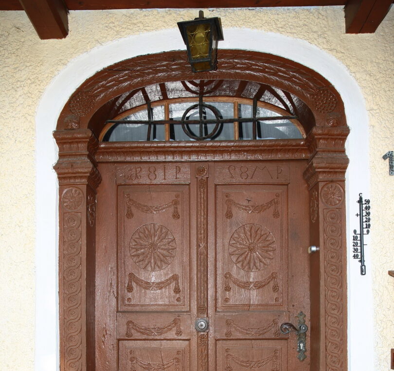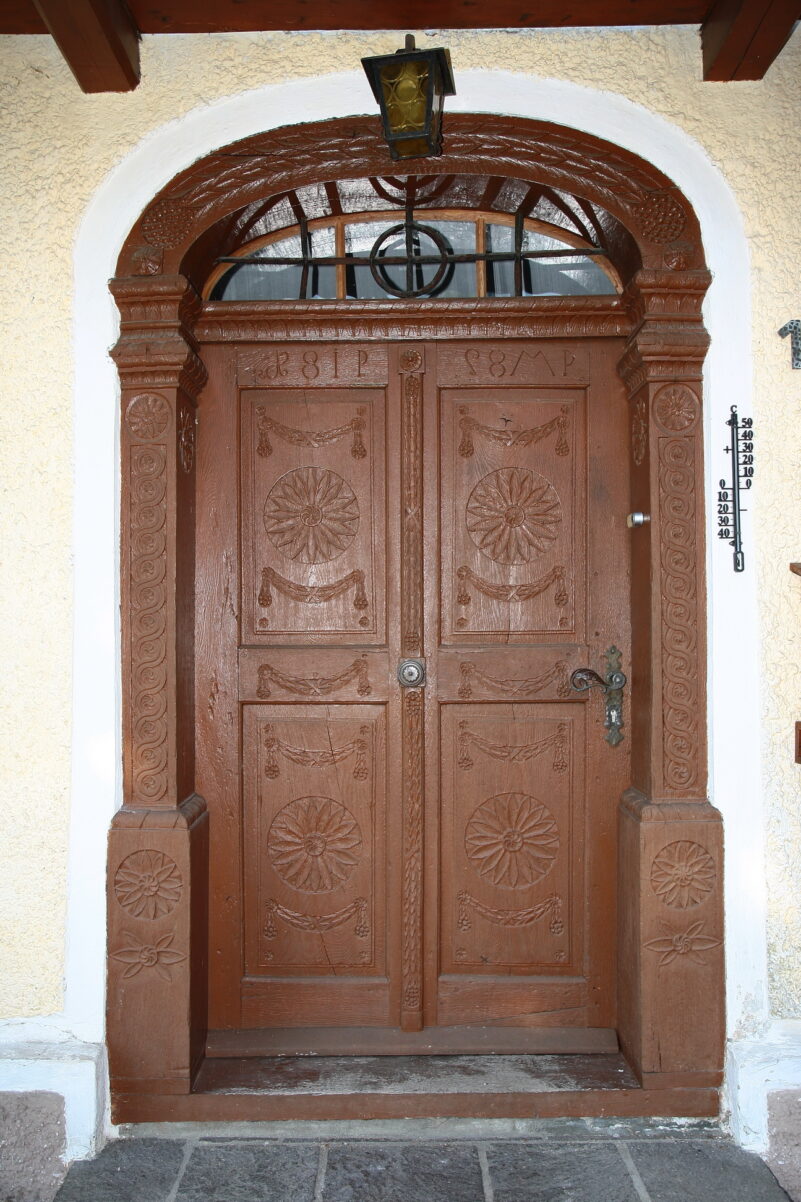 Am Türrahmen sind die Initialen H P und M P – wahrscheinlich Hans Puchauer und Magdalena Puchauer – eingearbeitet, sowie die vermutlich seitenverkehrte Jahreszahl 81 und 2 8 was wohl 1882 bedeuten sollte und vielleicht das Entstehungsjahr dieser kunstvoll gearbeiteten Türe sein könnte.