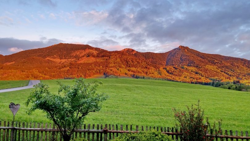 Still, ruhig und doch ein wenig faszinierend ist es in diesen Corona-Zeiten mit Ausgangsbeschränkungen auf dem Samerberg geworden. Dennoch lassen sich gerade für die Bewohner  immer wieder faszinierende Landschaftsbilder mit der Kamera festhalten – so wie diese aktuelle Aufnahme, die die von der Abendsonne beleuchtete Hochries mit dem vorgelagerten Grün des Hochplateaus zeigt