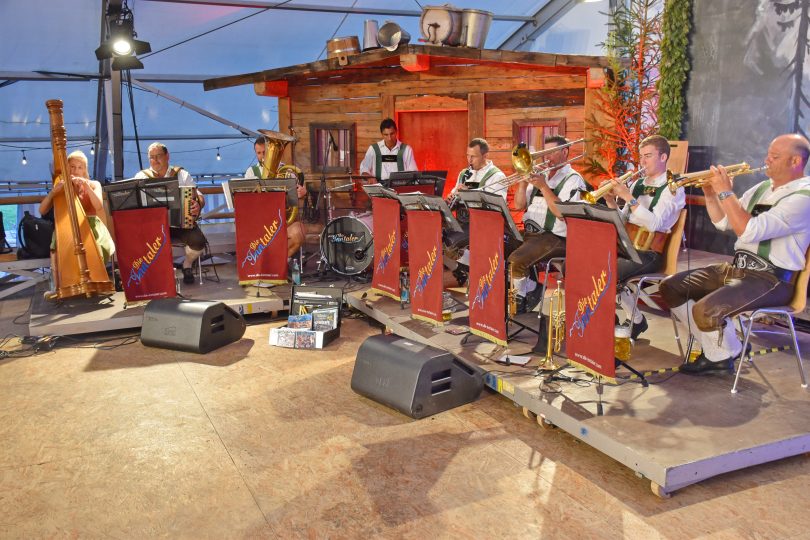 Mit dem Zillertaler Marsch eröffneten „Die Inntaler“ den Chiemgauer Tanzfestabend beim 84. Gautrachtenfest des Chiemgau Alpenverbandes im Schlechinger Festzelt. „Die Inntaler“ spielten in ihrer traditionellen Inntaler Besetzung. Seit siebzehn Jahren gehört ihre Leidenschaft der Musik und den Instrumenten wie die Harfe, Flügelhorn, Schlagzeug, Steierische Harmonika, Tuba, Klarinette und Posaune. Viele Stücke von Gottlieb Weissbacher und eigene Kompositionen konnten die offensichtlich gut gelaunten Gäste im Festzelt hören; denn sie hatten fast alle Lust das Tanzbein zu schwingen.