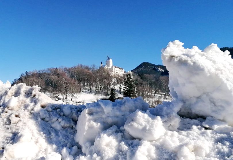 Weiß-Blau vom Prientaler Boden bis zum weiten Himmel zeigt sich in diesen Wintertagen die Burg Hohenaschau. Aus der Perspektive einer vom Schneepflug geschaffenen Wand schaut das mächtige Bauwerk relativ klein aus – aber das ist nur eine Frage des Blickwinkels.