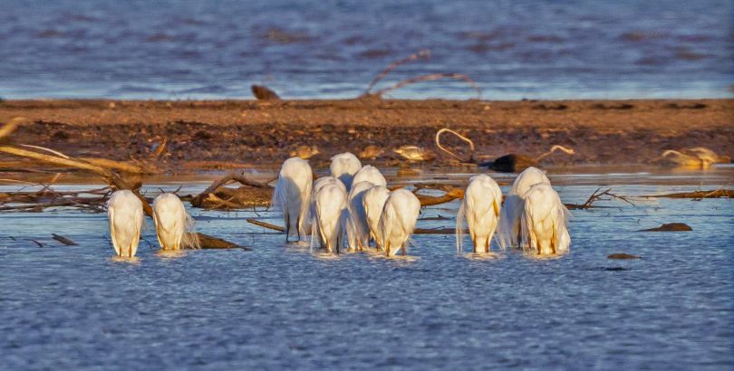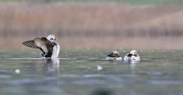 Im flachen Wasser hatten sich aber über 30 Silberreiher zum Schlafen versammelt. Ein vorbeifliegender Höckerschwan störte kurz und einige Köpfe wurden sichtbar. Als feststand, dass keine Gefahr drohte, verschwanden die Köpfe der Reiher wieder unter ihren Flügeln. Die kopflos scheinenden Reiher ruhten noch eine halbe Stunde, bis sie von der Morgensonne gewärmt zu ihren Tagesziel aufbrachen. Mehrere Stockentenerpel landeten vor dem Beobachtungsturm und warben eifrig schnatternd um die Enten. Zwei Erpel kämpften ausdauernd um das allerdings teilnahmslos wirkende Weibchen.