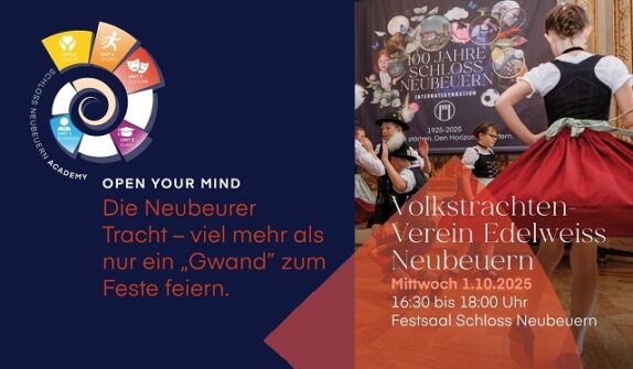 Begleitet vom „Ziachspieler” Alois Pichler, gaben zwanzig junge „Dirndl” und „Buam” unseren Schülerinnen und Schülern eine eindrucksvolle Kostprobe von Bayerischem Brauchtum. Im Rahmen unseres Bildung-Plus-Programmes „Schloss Neubeuern ACADEMY” unterstützte uns der Edelweiß-Verein mit einem Kulturbeitrag zur Neubeurer Tracht. Schule und Verein verbindet eine lange gemeinsame Geschichte. Unsere Schulgründerin Julie Freifrau von Wendelstadt war der Marktgemeinde sehr verbunden und stets eine leidenschaftliche Förderin der „Trachtensache”. Ihrem Einsatz ist es zu verdanken, dass auch die Frauen im Trachtenverein mittanzen durften.