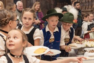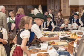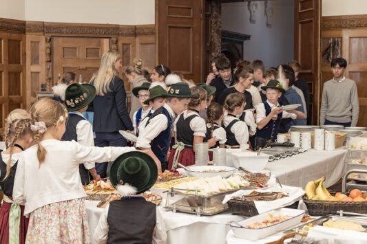 Natürlich war es auch für die jungen Trachtler ein aufregendes Ereignis – endlich mal die Räume des alten Schlosses sehen zu dürfen und sich ein Bild von unseren Schülern machen zu können. Diese gaben den kleinen Gästen gerne den Vortritt am abendlichen Buffet, das passend zum Anlass ganz bayerisch vorbereitet war. Die Kinder mischten sich selbstverständlich unter die Schüler im Speisesaal und genossen das außergewöhnliche Ambiente. Draußen wurde sogar auf unserem Streetball-Platz in neuer Freundschaft ein wenig gekickt. Ein gelungener Spätnachmittag, der schöner nicht hätte sein können und Schloss- wie Marktgemeinde wieder ein Stück näher zusammengeführt hat. Wir freuen uns auf ein Wiedersehen im Mai – wenn alles gutgeht – mit einer traditionellen Maibaum-Aufstellung.