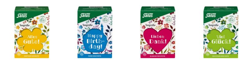 Vier Sorten umfasst die neue Serie “Teegrüße” von Salus: Der fruchtige Kräutertee „Viel Glück!“ mit Nanaminze und Erdbeeren, der kräftige Gewürztee „Alles Gute!“ mit schwarzem Assam-Tee, Zimt und schwarzem Pfeffer, der feine Kräutertee „Happy Birthday!“ mit Tulsi und Lemongrasöl und der blumige Früchtetee „Lieben Dank!“ mit Johannisbeeren, Holunderbeeren und Rosenblüten.