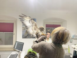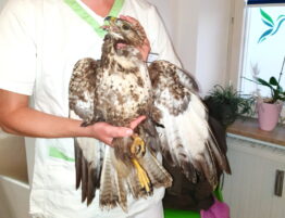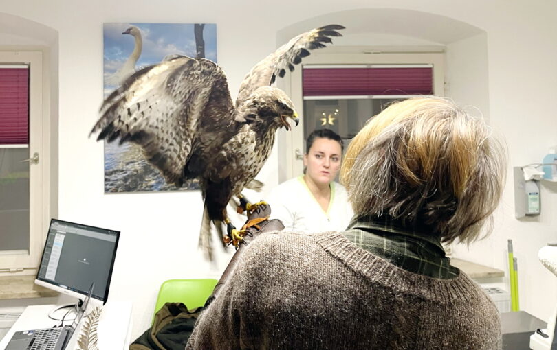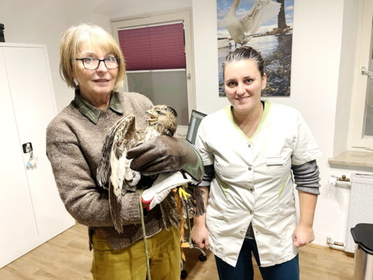 „Viele Fahrzeuge fuhren in beide Richtungen an uns und am sichtlich um das Überleben kämpfenden Greifvogel vorbei. Lediglich eine uns namentlich nur als Angela bekannte Frau wendete und kam zurück und übergab uns einen Sack, damit wir den Vogel auf- und mitnehmen können“ – so Konrad Weber. Wohl aufgrund eines Schock-Zustandes ließ sich der Vogel leicht mitnehmen. Alsdann ging es zur Chiemgauer Tierarztpraxis von Frasdorf. Dr. Andreas Weiß empfahl für diesen speziellen Fall den Besuch der Vogel- und Reptilien-Praxis in Prien. Dort angekommen wurde weitere Hilfe zuteil und es wurde festgestellt, dass der verletzte Vogel keine Brüche hat und überleben kann. Die Vogelpraxis übernahm die Untersuchungen für eine Tierschutz-Spende in Höhe von 50 Euro und schlug vor, den frisch behandelten Vogel für ein paar Tage in die Hände einer Falknerin zu geben. Hernach soll eine abschließende Untersuchung folgen und dann könnte der Mäusebussard wieder der freien Natur übergeben werden. Und so war es dann: die Priener Tierärztin Melina Zwack kontaktierte die Falknerin Katharina Weinberger aus Eggstätt und übergab den Greifvogel. Fünf Tage später trafen sie sich wieder in der Vogel-Praxis, dabei erklärten sie: „Greifvögel halten sich vermehrt an Autobahnen aus, um dort überfahrene oder laufende Mäuse zu erwischen. Dieser Vogel war wohl sehr geschwächt, denn er musste noch stark entwurmt werden. Sein verletztes Auge konnten wir heilen und so können wir ihn wieder der Natur zurückgeben“.