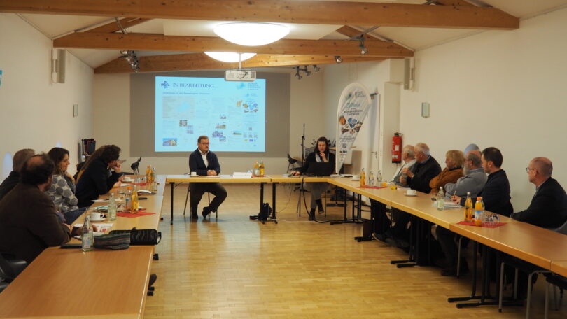 Bericht: Römerregion Chiemsee – Foto: Marion Tippmann-Böge – Bürgermeister Gerhard Wirnshofer (vorne links) begrüßte im Saal der Schlossökonomie in Grabenstätt das Akteursnetzwerk der „Römerregion Chiemsee“. Andrea Krammer von der Koordinationsstelle der Römerregion Chiemsee (vorne rechts) informierte über die Aktivitäten des letzten Jahres und die Planungen für 2023 im Rahmen des alljährlichen Informations- und Abstimmungstreffens.