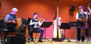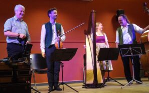 Mit einem rassigen „Tango diatonique“ begann das Quartett ebenso wie vor 10 Jahren bei ihrer CD-Präsentation. Und heute sind sie immer noch mit wachsender Spielfreude unterwegs: Hermann Huber an der steirischen Harmonika oder an der Klarinette, der ungarische Geiger Zoltan Laluska, Ingo Nagl am Kontrabass und neuerdings an der Harfe Verena Meurers-Zeiser. Sie musizierten auf höchstem Niveau, ließen ihre Soli brillant und virtuos aufblitzen, dialogisierten musikalisch miteinander und machten mit Blick auf verschiedene Musikkulturen daraus ein wunderbares Ganzes. Jeder musikalischen Ausprägung – ob bayrisch, französisch, ungarisch oder jiddisch – wandten sie in einem Perspektivenwechsel ihre uneingeschränkte Aufmerksamkeit zu, und kristallisierten das Charakteristische heraus. In den Soli stellte jeder den brillanten Klang des eigenen Instruments heraus und bettete ihn dann wieder in den Gesamtklang ein. Der Korpus des Kontrabasses diente schon mal als Schlagzeug oder sein Bogen mutierte zum Geräuschemacher, wie zum Beispiel beim „Ameranger Schlossgespenst-Landler“, wo das Knarzen einer Holztüre lautmalerisch auf einer Saite nachgeahmt wurde.