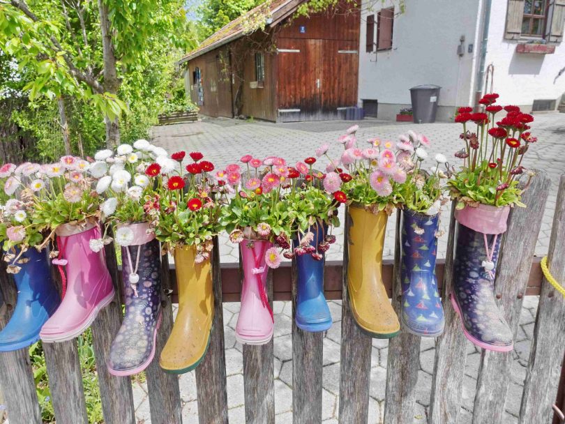 Diesen Blumen am Wegesrand und an der Zaunwand in der Gemeinde Rohrdorf dürfte es nicht so schnell zu nass eingehen. Schließlich haben sich die kreativen Garten- und Blumenbesitzer allerhand einfallen lassen und sie haben sich im wahrsten Sinne auf die Socken gemacht, damit mit ihren Stiefeln die Pflanzen eine passende Heimat haben. Und so haben Blumen wie Betrachter ihre Freude.
