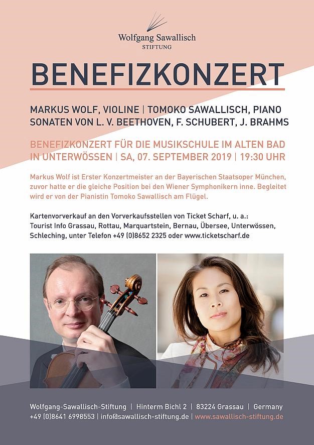 Ein Benefizkonzert mit dem Konzertmeister und Violinisten Markus Wolf und der Pianistin Towoko Sawallisch findet am kommenden Samstag, den 7. September 2019, um 19.30 Uhr in der neuen Achentalhalle (Altes Bad) in Unterwössen statt. Der Konzerterlös kommt der Musikschule mit den Zweigstellen Grassau, Bernau, Marquartstein, Reit im Winkl, Schleching, Staudach-Egerndach, Unterwössen und der Wolfgang-Sawallisch-Stiftung zu Gute.