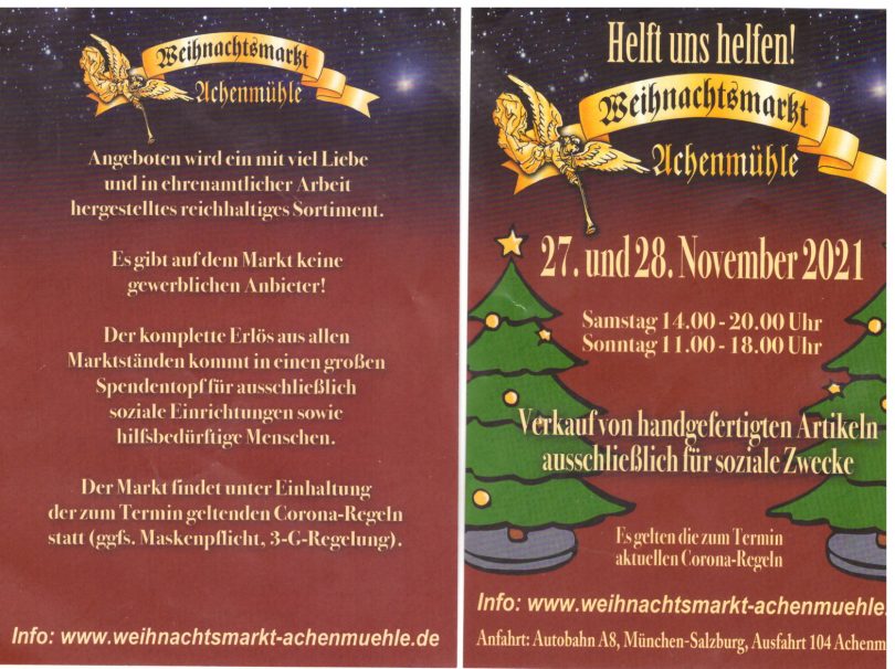 Nach drei Jahren ist es wieder so weit! Der Achenmühler Weihnachtsmarkt kann am 27. und 28. November 2021 auf dem Dorfplatz in Achenmühle stattfinden. Aufgrund der Corona-Pandemie muss jedoch auf das sonst so anspruchsvolle Rahmenprogramm verzichtet werden. Das selbst hergestellte und ansprechende Sortiment an weihnachtlichen Artikeln, kulinarischen Leckerbissen oder praktischen Dingen in 20 Zelten und Buden entschädigt jedoch dafür! Jede und Jeder kann in der heimeligen Atmosphäre des Marktes und mit Essen und Trinken „to go“ sich einstimmen auf die kommende Advents- und Weihnachtszeit. Der Veranstalter „Weihnachtsmarkt Achenmühle e. V.“ stellt den diesjährigen Markt wieder unter das Motto „Helft uns helfen“. Der Reinerlös des Marktes wird für gemeinnützige sowie mildtätige Projekte vorwiegend in der Gemeinde sowie im näheren Umfeld gespendet. Sämtliche Tätigkeiten erfolgen durchwegs ehrenamtlich und freiwillig. Jeder stellt sich in den Dienst der guten Sache. Das gesamte Angebot ist von den Markthelfern vorbereitet, es gibt keinerlei gewerbliche Anbieter.