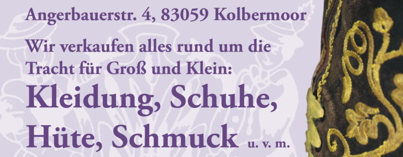 Wer gebrauchte Trachten kaufen oder verkaufen will, kann dies wieder über den GTEV „D’Mangfalltaler“ erledigen. Am Freitag, 21. März wird von 17 Uhr – 19 Uhr die Ware im Trachtenheim, Angerbauerstraße 4, angenommen und am Samstag von 13 Uhr – 16 Uhr angeboten. Vom Erlös werden 10 % für die Jugendarbeit des Vereins einbehalten. Angenommen wird alles zur Tracht: Kleidung, Schuhe, Hüte, Schmuck usw.