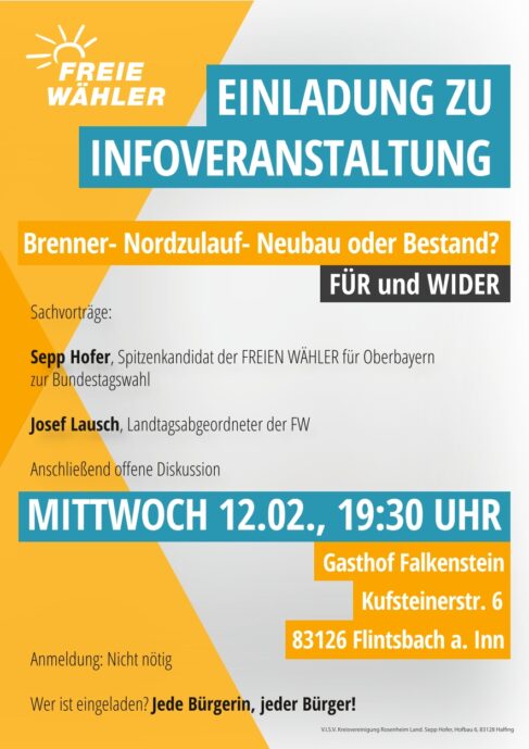 Am Mittwoch, den 12. Februar laden die Freien Wähler zu einem Diskussionsabend zum Thema „Brenner-Nordzulauf, Neubau oder Bestand, Für und Wider“ in den Gasthof Falkenstein, Kufsteinerstr. 6 nach Flintsbach ein.