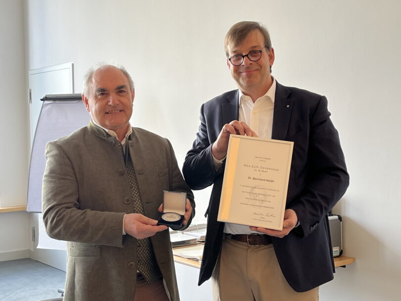 Text: LfL Freising – Foto: DLG – Dr. Bernhard Haidn (li) erhält von DLG-Präsident Hubertus Paetow die silberne Max-Eyth-Denkmünze.