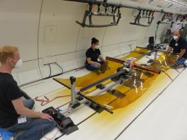 Ein weiterer „Passagier“ auf dem Parabelflug ist der BionicWingSat, ein entfaltbarer Weltraum-Flügel, der ebenfalls gemeinsam von DLR und NASA entwickelt wurde. Hier sind Insekten Vorbild, die beim Aufspannen von Flügeln keine einzelnen Elemente nutzen, sondern Systeme, in denen die einzelnen Elemente zu einem werden. Besonders die hocheffizienten faltbaren Flügel von Ohrenkneifern faszinierten die Forschenden. In puncto Stabilität nahmen sie die steifen und robusten Flügel der Libellen als Inspiration. Mit einem 3D-Druck-Fertigungsverfahren erzeugten die Wissenschaftlerinnen und Wissenschaftler die Weltraum-Flügelstruktur und untersuchten diese ebenfalls in der Schwerelosigkeit. Sie wollen testen, wie gut sich solche Flügel entfalten, wie flach sie gefaltet werden können und welche Kräfte auf Satelliten von ihnen ausgehen.