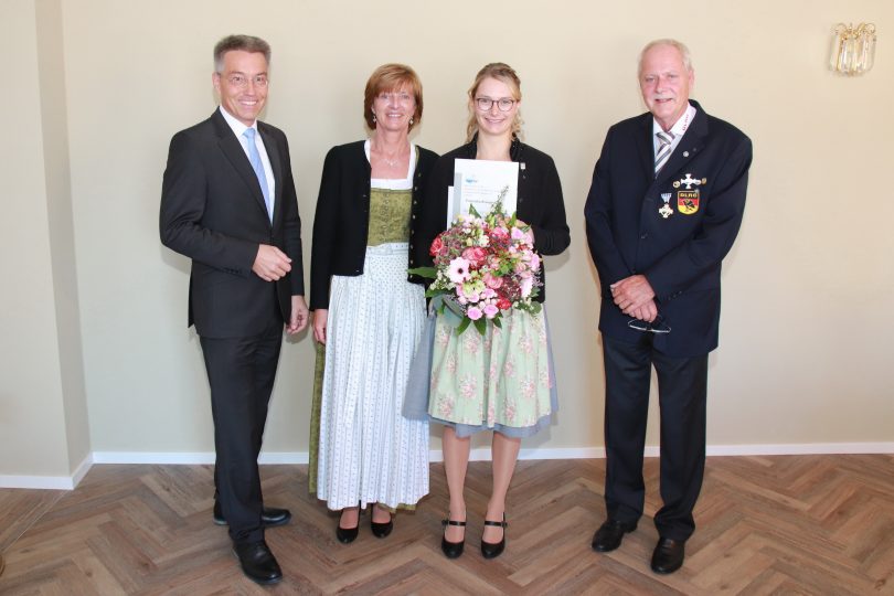 Bericht und Foto: LRA Rosenheim – Ehrung für Franziska Krimplstötter von links: Landrat Otto Lederer, 3. Bürgermeisterin Anna Wallner von Bruckmühl, die Geehrte und Ingo Flechsenhar von der DLRG