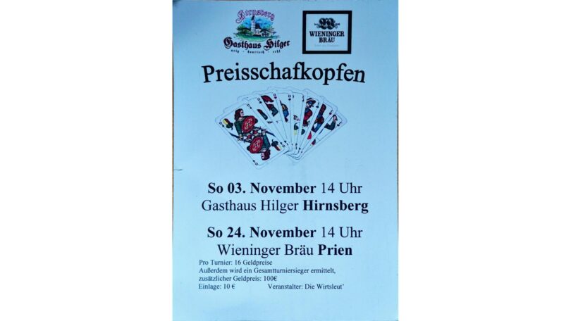Gute Tradition seit einigen Jahren ist es, dass Gastwirt Wolfgang Kirner im November zu einem Doppel-Preisschafkopfen im Gasthaus Hilger in Hirnsberg und im Wieniger Bräu in Prien am Chiemsee einlädt. Heuer findet das erste Turnier in Hirnsberg am Sonntag, den 3. November, um 14 Uhr statt. Der zweite Wettkampf in Prien wird am Sonntag, den 24. November, um 14 Uhr ausgetragen. Pro Turnier werden 16 Geldpreise vergeben, und ein Gesamtsieger aus beiden Preisschafkopfen erhält zusätzlich 100 Euro. Die Teilnahmegebühr beträgt jeweils 10 Euro.