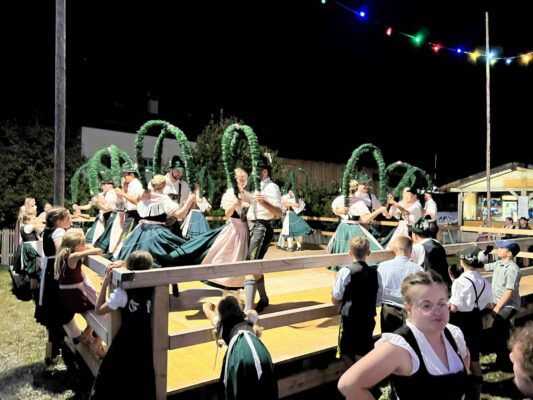 Erfreut und dankbar zugleich über ein so gelungenes Fest, haben die Baschtler Trachtler am Montag, 11. August gleich noch ein spontanes zweites Dorffest arrangiert. Und wieder hat das Wetter gehalten und eine gelungene Wiederholung mit den Samerberger Musikanten versprochen. Die angenehmen Sommernachtstemperaturen luden ein, bis spät in die Nacht zu bleiben. Könenden Abschluss eines jeden Dorffestes waren der Kronentanz und der Holzhacker der aktiven Plattlergruppe.