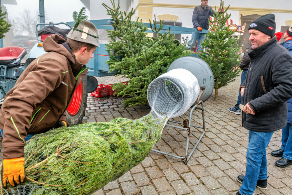 Weihnachtsbaumkauf mit Handarbeit: Beim Samerberger Dorfadvent gehörte auch der Christbaumverkauf dazu. Vor Ort werden die frisch ausgesuchten Bäume direkt eingenetzt – bereit für den Heimweg und fürs Fest daheim.