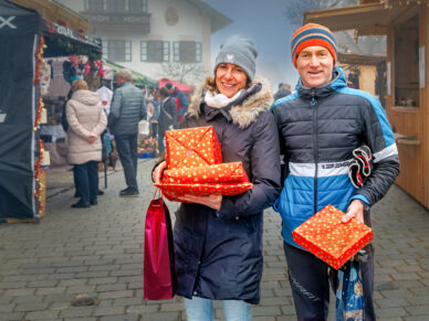 Mit vollen Händen und einem breiten Lächeln geht es über den Törwanger Dorfplatz: Ein Ehepaar freut sich über die gefundenen Geschenk-Schätze beim Samerberger Dorfadvent – und nimmt neben den Päckchen vor allem eines mit nach Hause: echte Vorfreude auf Weihnachten.