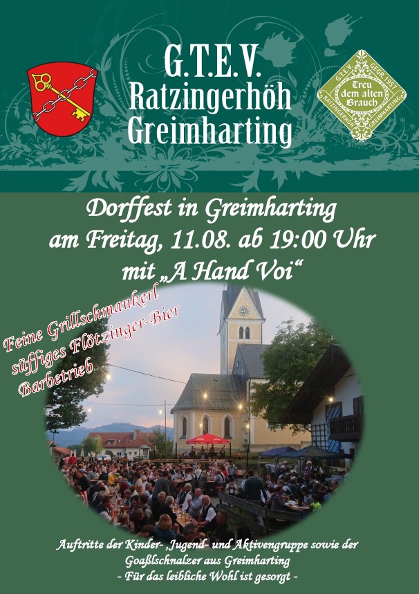 Am heutigen Freitag, 11. August laden die Greimhartinger Trachtler vom GTEV “Ratzingerhöhe” zu ihrem Dorffest auf dem Platz vor dem Gemeindehaus ein. Beginn ist um 19 Uhr, es spielt die Musik “A Hand vui”.