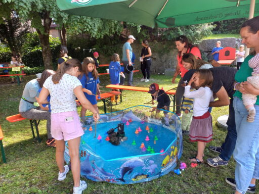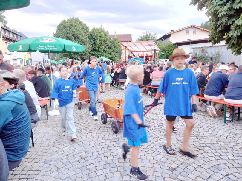 Die Kinder waren glücklich mit den vielen Spielmöglichkeiten, die sie zahlreich und gern nutzten. Auch an Gaumenfreuden wurde nicht gespart, die Besucher ließen sich die saftigen Hendl, Würstl vom Grill, Radi und Kas gut schmecken. Frisches Bier an der Pilsbar, Wein und natürlich auch Kaffee und Kuchen haben nicht gefehlt. An langen Tischen saßen die Besucher beisammen und genossen die gute Stimmung. Im nächsten Jahr wird kein Dorffest stattfinden, da alle Vereine eingespannt sind beim in Marquartstein stattfindenden Gaufest des Chiemgau Alpenverbandes.
