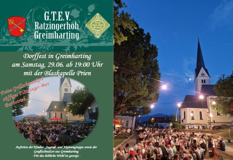 Der Trachtenverein “Ratzingerhöh” Greimharting lädt am Peter-und-Paul-Tag, Samstag 29. Juni, herzlich zu ihrem traditionellen Dorffest ein. Ab 19:00 Uhr sorgt die Blaskapelle Prien für Stimmung.