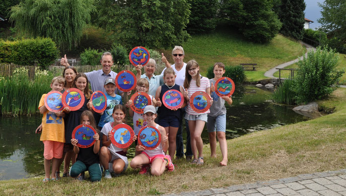 Um dieses Wissen an Gewässern ständig anschaulich darzustellen, wurden danach in der Schule Schilder “Bitte nicht füttern” gemalt. Diese Zeichnungen waren so gelungen und individuell, daß die Bürgermeister Anton Baumgartner und Bernhard Hainz die Schilder aufstellen wollten. Der Verein zur Förderung der Dorfgemeinschaft Breitbrunn-Gstadt e.V. hat alle 13 Zeichnungen auf richtige Verkehrsschilder drucken lassen. Am 8.6.2018 wurde das erste Schild “im” Weiher – mit fast allen Beteiligten – aufgestellt und die restlichen werden demnächst an verschiedenen Gewässern im Gemeindegebiet der Verwaltungsgemeinschaft montiert. Mit einem g´schleckten Eis aus der Bio-Insel war die Aktion noch vor dem Gewitter beendet!