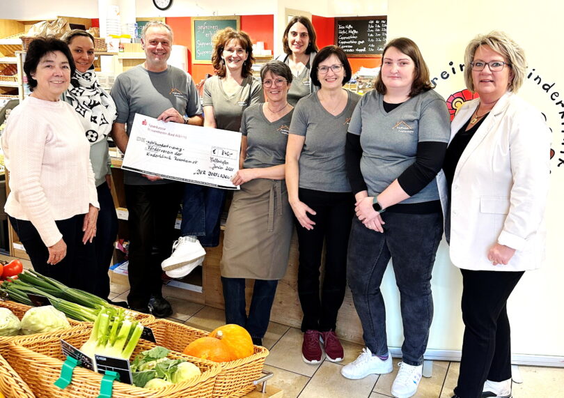 Bericht und Foto: Förderverein Kinderklinik Rosenheim – Auf dem Bild von links nach rechts: Helene Lohner (Schriftführerin des Fördervereins); Sanja Cvetko (Schatzmeisterin); Stefan Schomburg (Marktleiter), Alex, Margot, Ramona, Andrea und Dagmar (Mitarbeiterinnen des Dorfladens Pfaffenhofen)