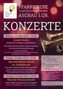 Am 29. März stimmt alpenländische Musik auf die Passionszeit ein. Unter dem Motto “Für mich nahmst du das Kreuz auf mich” spielen die Hohenaschauer Bläser, die Schwarzensteiner Sängerinnen und die Wössener Erntedank-Gitarrenmusi auf, Anneliese Staber wird verbindende Texte vortragen. Die Leitung haben Gabi Reiserer und Hans Wiesholzer.