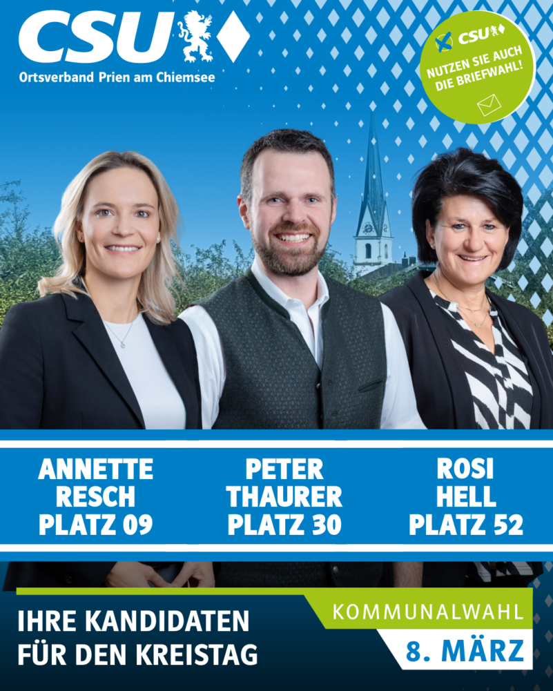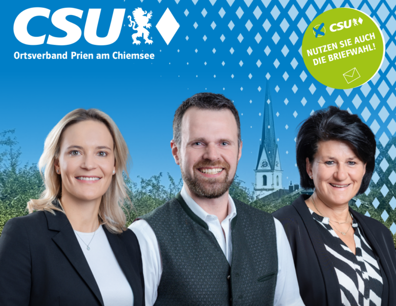 Die Marktgemeinde Prien a. Chiemsee als Tourismus-, Schul- und Klinikort ist ein wichtiger Partner für den Landkreis Rosenheim. In diesem Sinne haben sich aus dem CSU-Ortsverband drei Personen bereit erklärt, sich für den Rosenheimer Kreistag aufstellen und wählen zu lassen.