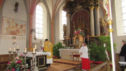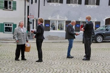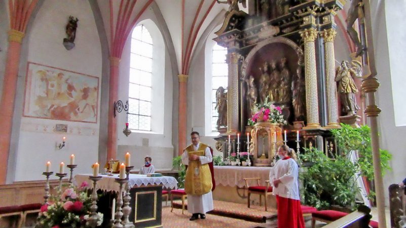 Dreifalltigkeit, das Patrozinium der Kirche von Altenbeuern, musste heuer in kleiner Form gefeiert werden. Anmeldung zum Gottesdienst war nötig, die Zahl der Kirchgänger ist deshalb begrenzt. Pfarrer Christoph Rudolph und die Messdiener mit Mundschutz und auch das Wetter war nicht Feiertag tauglich-kein schöner Festtag – doch: “werd wieder anders wern”- so auch bei der letzten Maiandacht des Jahres, die traditionell von der KAB-Gruppe gestaltet wurde. Eigentlich immer am Feldkreuz beim Pfarrheim mit Musik und abschließendem Eis-Essen für alle. Heuer nun musste die Andacht in die Pfarrkirche verlegt werden.