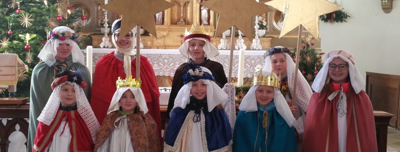 Neun Buben und Mädchen waren in der alten Gemeinde Umrathshausen als Sternsinger unterwegs und sammelten 1724,70 Euro für das weltweite Kinderhilfswerk. Bei steifem Wind zogen sie durch den Ort, blieben bei jeder Haustür stehen und sangen das Sternsingerlied. In Versform wünschten die „Weisen aus dem Morgenland“ Gesundheit und Glück im neuen Jahr und schrieben mit Kreide das Kürzel „C+M+B“ Christus mansionem benedicat an die Haustüren. Als Lohn erhielten sie dafür ein paar Süßigkeiten in die Stofftasche und ein paar Euro in die Sammelbüchse. Die Süßigkeiten, Orangen, Mandarinen und Äpfel teilten sich die Könige nach ihrem langen Weg auf, die Sammelbüchse mit dem Geld geht an die Sternsingeraktion.