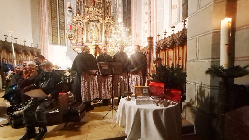 Seit Jahren ist Leon Parzinger fester Bestandteil der Mitwirkenden, mit den gekonnt gespielten Stücken auf seiner Ziach bringt der junge Musiker so manch einen im Publikum zum Staunen und Schmunzeln. Diakon Wolfgang Mösmang holte mit der in bayrisch erzählten Weihnachtsgeschichte das Geschehen vor mehr als 2000 Jahren mit Herbergssuche und der Geburt Christi bis hin zu den drei Waisen Herren, die in der Nacht von Gott gewarnt wurden und so nicht zu Herodes zurückkehrten, in Erinnerung. Mit Liedern und instrumentalen Stücken haben die Mitwirkenden die einzelnen Abschnitte ergänzt. Zu Dreikönig gehört es traditionell, dass Weihrauch, Kreide, Salz und das Dreikönigswasser geweiht werden. Zusammen mit Diakonatspraktikant Toni Stadelmann hat Diakon Wolfgang Mösmang die segneten Worte gesprochen und ging anschließend mit dem neu geweihten Weihwasser durch die Kirche um die Anwesenden damit zu segnen.