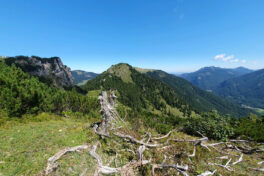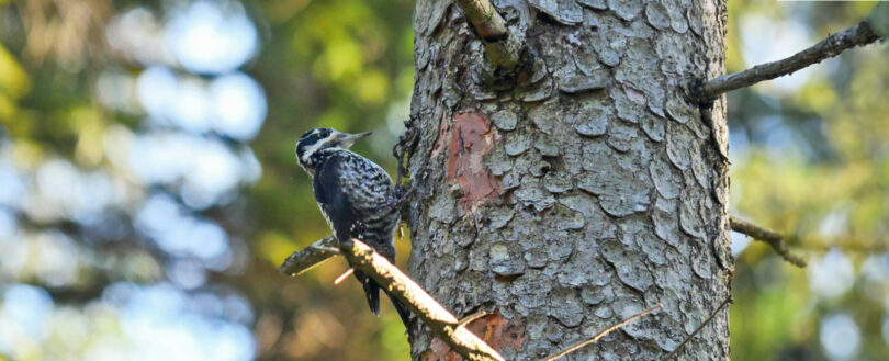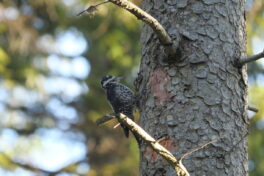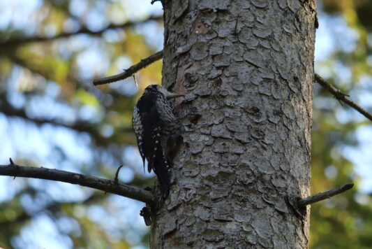 Nach dem Regen waren wieder ein sonniger Tag und eine Bergwanderung angesagt. Nach der Anreise mit der Aschauer Bahn ging es mit dem Fahrrad ins schöne Priental zur Brandelberg Alm. Noch auf dem Rad hörte ich ein leises Klopfen und Suchen und kurz darauf entdeckte ich einen weiblichen Dreizehenspecht. Dieser Urwaldspecht kommt eigentlich nur in Bergwäldern vor. Neben den namensgebenden drei Zehen ist er der einzige schwarz-weiße Specht bei uns und wenig scheu. Wer ihn einmal entdeckt hat, kann ihn lange beobachten, denn er ist meist recht ruhig und klopft leise.