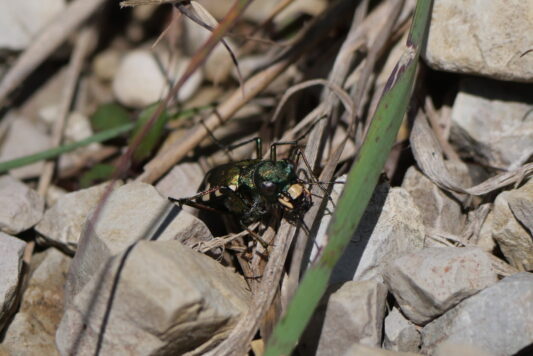 Nach einem weiteren Stück auf dem anstrengenden, aber reizvollen Weg entdeckte ich eine für mich neue Art. Den Alpen-Sandlaufkäfer, der anhand seiner Mundwerkzeuge sofort als räuberischer Käfer zu erkennen ist. Das grelle Licht und der Drang des Käfers, die Ameisen aus dem Hinterhalt zu überraschen, machten das Fotografieren zwar schwierig, aber am Ende konnte ich ihn doch gut bestimmen.