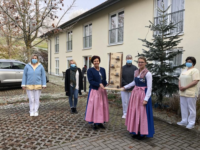 Vor dem Eingang wurde die Abordnung von der Qualitätsbeauftragten Laura Hewel sowie den Mitarbeiterinnen Karola Stoffel, Lumi Stancin und Klaudia Aschenbrenner empfangen. Das Personal der Einrichtung freute sich sehr, dass ihre Schützlinge in diesen schwierigen Zeiten von den Riedlstoanern nicht vergessen werden. Das hübsche Adventsarragement aus Holz und Licht werde einen würdigen Platz erhalten, versicherten sie. „Obwohl unsere Bewohner sehr tapfer und die Besucher sehr verständnisvoll sind und wir die Situation allgemein gut meistern, sehnen sich natürlich alle danach, dass so bald wie möglich wieder Normalität bei uns einkehrt“, berichtet Laura Hewel. Ein Hinweisschild mit der Aufschrift „Zum Fensterln“ auf dem Parkplatz zeugt vom Einfallsreichtum und Humor der Mitarbeiter auch und besonders unter den bestehenden Corona-Einschränkungen. An einem ebenerdigen Fenster können Bewohner zumindest Kurzbesuche genießen ohne sich dabei der Gefahr einer Ansteckung auszusetzen.