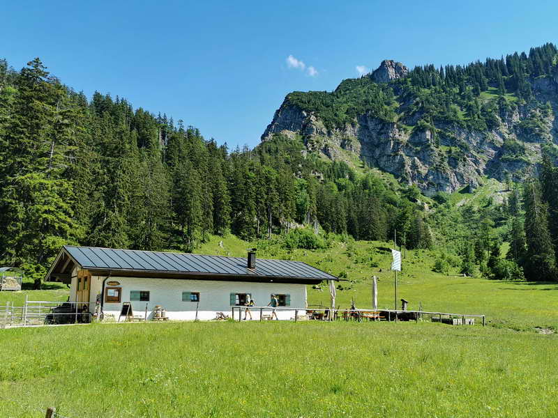 Die Brachtalm bietet Almbrotzeiten, Kuchen und Getränke an, und wer beim Aufstieg sehr geschwitzt hat, kann sich in der almeigenen Dusche erfrischen (siehe Foto).