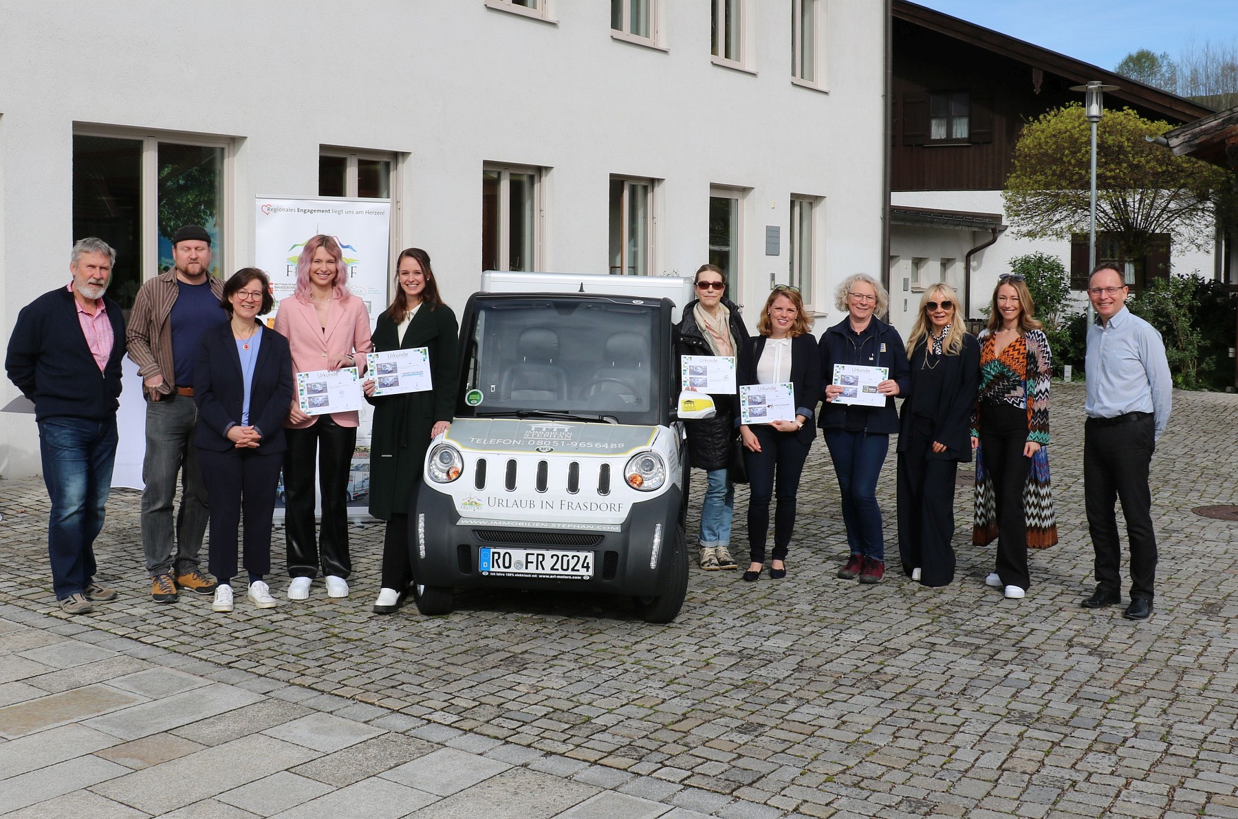 Bürgermeister Daniel Mair (rechts) und die Förderer und Sponsoren des ersten gemeindlichen Elektrofahrzeugs vom Typ ARI 458 der Gemeinde Frasdorf.