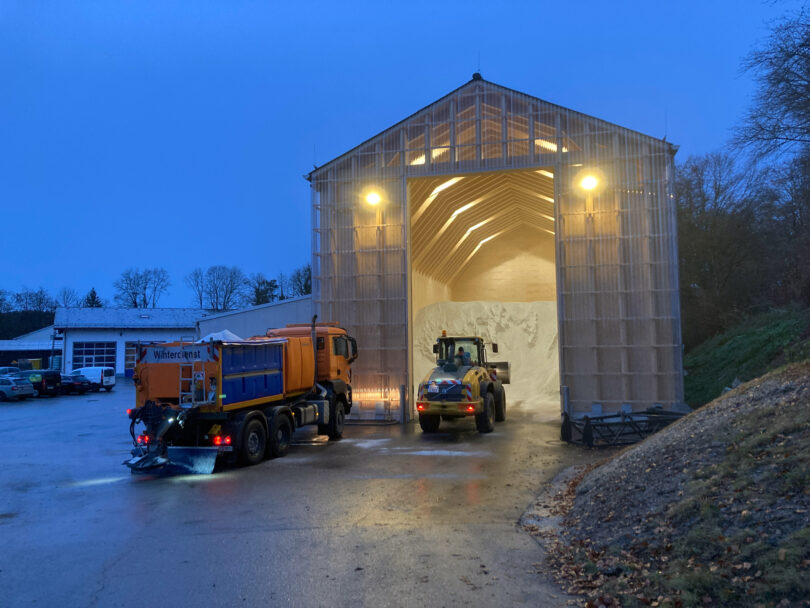 Aber nicht nur der Lagerraum, auch die Nachhaltigkeit spielte beim Neubau eine Rolle: Wegen der sehr hohen Aggressivität von Salz wurde die Lagerhalle – anders als die vorherige – vollständig aus Holz errichtet. Holz besitzt im Vergleich zu Metall oder Beton eine natürliche Widerstandsfähigkeit und hat sich beim Bau von Salzlagerhallen bewährt. Auch bei den Verbindern wurde auf den Einsatz von Metall verzichtet. Stattdessen wurden Eichenholznägel und Holzzapfenverbindungen verwendet, um die im Werk verleimten Holzbauelemente zu verbinden – in Anlehnung an historische, zimmermannsmäßige Konstruktionen. Das sorgt für eine hohe Lebensdauer der Halle bei einem gleichzeitig geringen Unterhaltsaufwand.