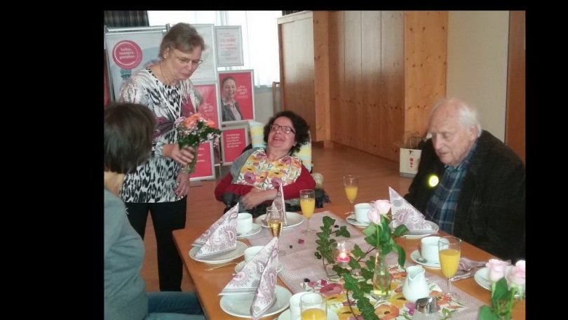 Foto: privat – Frau Eder gratuliert ihremGruppenmitglied Fatmus Gashi zum Geburtstag und verabschiedet sie gleichzeitig, da sie in Kürze umzieht. Weiter zu sehen ist Herr Fritz Gebhardt-Seele.