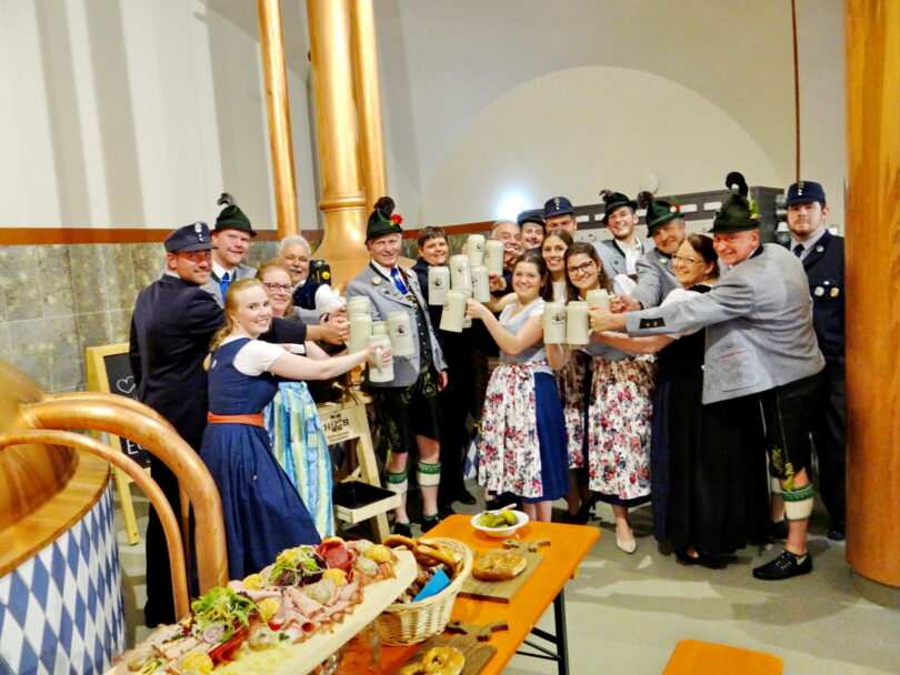 Im Sudhaus war eine vortreffliche Brotzeit hergerichtet. Sailer zeigte die kupfernen Sudpfannen und nach ein paar fachlichen Ausführungen gab es aus dem Holzfaß die erste Maß. Festleiter Ludwig Estner durfte das erste Faß anstechen. Ab Donnerstag 15. Juni beginnen in Eggstätt die Festwochen zu 150 Jahre Feuerwehr und 100 Jahre Trachtenverein.